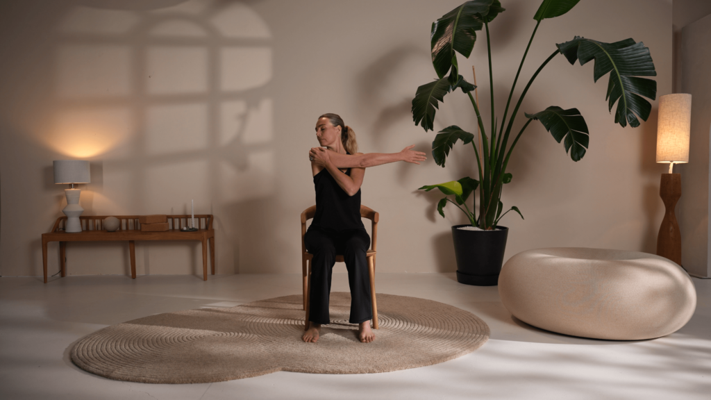 Cross-Body-Schulterstreckung vom Stuhl aus (R)